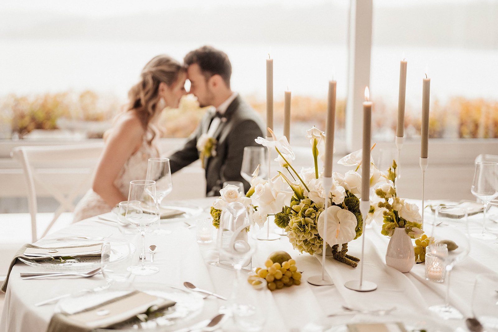 Klare Linien, hochwertige Materialien und gezielt eingesetzte Details sorgen für ein harmonisches Gesamtbild. Grüne Akzente in Form von Trauben, Birnen, Blättern und floralen Elementen bringen Frische und Lebendigkeit auf den Tisch.